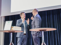Joachim Wiskemann (links) erhält die Auszeichnung von Uwe Martens, dem Vorsitzenden des Krebsverbands Baden-Württemberg. Foto: Maryna Stamatova / UKF