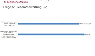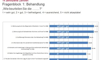 Der Fragebogen bei der diesjährigen Befragung wurde durch Prof. Joachim Weis und seinem Team von der Selbsthilfe-Professur überarbeitet. Gefragt wurde zum Beispiel nach der Betreuung durch die pflegerischen Mitarbeiter/innen. 93,5 % bewerteten diese als gut bis sehr gut. Die Betreuung durch die Ärztinnen und Ärzte bewerteten 93 % der Befragten als gut bis sehr gut. Weitere Details finden Sie in den Grafiken unten.