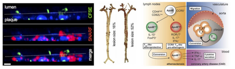 Most people worldwide die of cardiovascular disease, such as of heart attack and stroke. Often, the underlying cause is atherosclerosis, a disease that fuels the build-up of vessel-narrowing plaques in arteries that are vital because they supply the heart and the brain. During early disease, a subgroup of white blood cells called T cells infiltrate the plaque and drive its growth. Usually, these immune cells protect from infection, but in atherosclerosis some T cells attack the body itself. This is why atherosclerosis is now understood as auto-immune disease. They get attracted by the protein ApoB-100, which is a part of LDL-cholesterol in the plaque. However, little is known about the function of these self-reactive T cells and how to dampen their harmful action. Using innovative tools, such as 2-photon microscopy of explanted atherosclerotic plaques (see above, left), combined with classical atherosclerosis tools, such as quantification of atherosclerotic lesions in mice (middle), and MHC-multimers to track single auto-reactive T cells we are asking some intriguing questions: What is the frequency and function of autoreactive T cells? Which proteins and genes do they express? When transferred into another animal, how do these autoreactive T cells change atherosclerosis in the recipient? We are also trying to track auto-reactive T cells in humans with coronary artery disease. Deciphering how the immune system and the T cell response work in atherosclerosis will not only boost our understanding of auto-immunity in atherosclerosis but it will also build the basis to define new therapies. Our long-term goal is to define the properties of a vaccine against ApoB-100 to modify the immune system in a way that protective autoreactive T cells are boosted. Such therapy would represent the first causal preventive therapy against the atherosclerosis-related immune response in future.