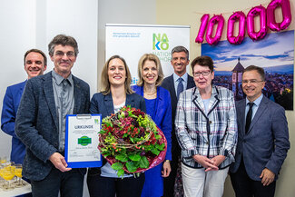 Die 10.000ste Probandin (3.v.l.) der Freiburger NAKO-Studie wird begrüßt vom Leitungsteam des NAKO-Studienzentrums Freiburg, sowie von Prof. Dr. Frederik Wenz (3.v.r), Leitender Ärztlicher Direktor des Universitätsklinikums Freiburg, Stadträtin Renate Buchen (2.v.r.) und Prof. Dr. Lutz Hein (1.v.r.), Studiendekan Humanmedizin der Medizinischen Fakultät an der Uni Freiburg. © Universitätsklinikum Freiburg/Britt Schilling