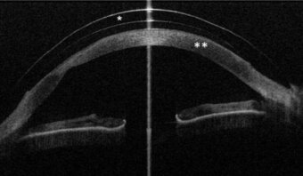 Das Vorderabschnitts-OCT des vorderen Augenabschnitts nach Anpassung einer Sklerallinse liefert ein "Schnittbild" durch die Sklerallinse (*) und Hornhaut (**). Man sieht nun, dass die Linse die gesamte Hornhaut überspannt, nur im Sklerabereich aufliegt und dass sich zwischen Linsenrückfläche und Hornhautvorderfläche ein flüssigkeits-gefüllter Raum befindet.
