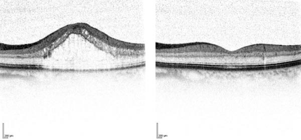 Abb. 2: Therapie des Makulaödems mit intravitrealer Injektion von VEGF-Inhibitoren. Das durch die erhöhte Gefäßpermeabilität entstandene Makulaödem (linkes Bild) kann durch intravitreale Injektion von anti-VEGF-Medikamenten vollständig resorbiert werden (rechtes Bild). Allerdings sind meist mehrere Injektionen notwendig und nicht bei allen Patienten zeigt sich ein Ansprechen auf die Therapie.