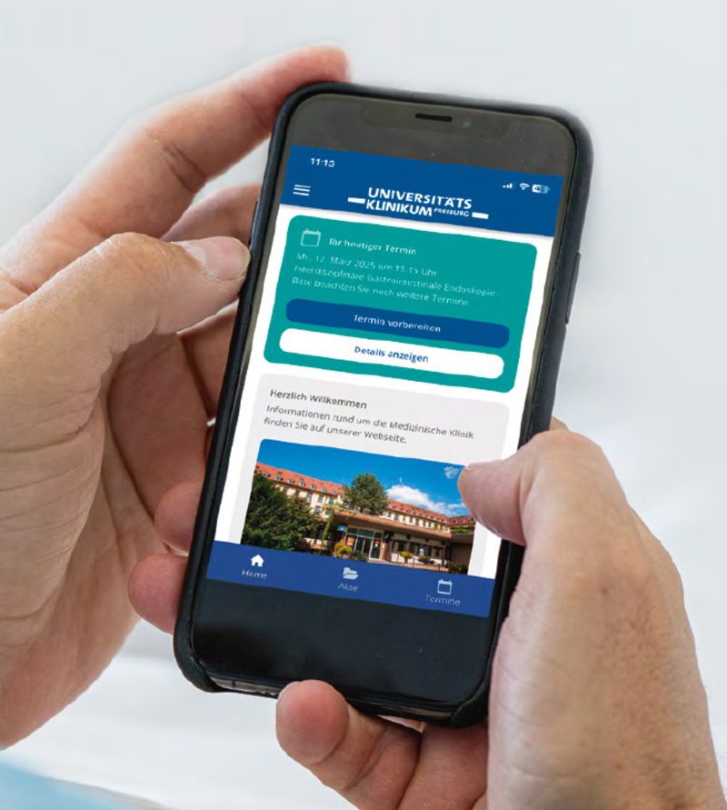 Mit der App des Universitätsklinikums Freiburg behalten Sie stets den Überblick. In der App erhalten Sie die wichtigsten Informationen zu Ihrem Klinikaufenthalt.
