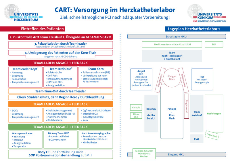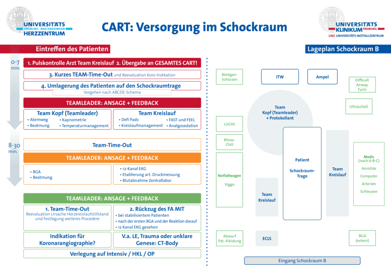 Nach dem „Freiburger Modell“ trifft sich nach standardisierter Patientenanmeldung ein spezialisiertes Team aus Notfallmediziner*innen, Intensivmediziner*innen, Kardiolog*innen, Radiolog*innen, Pflegefachkräften aus der Intensiv- und Nofallpflege und ggf. Kardiotechniker*innen, um die Patient*innen aus der rettungsdienstlichen Versorgung in die klinischen Strukturen zu übernehmen. Ziel des CARTs ist es, präklinisch reanimierte Patient*innen möglichst nach festgelegten diagnostischen und therapeutischen Pfaden zu versorgen, welche auf evidenzbasierten Leitlinien beruhen. Gleichsam werden durch die bereits primäre Anwesenheit der nach der gemeinsamen Erstversorgung weiterbehandelnden Kolleg*innen der Intensivtherapie (IMIT) Informationsverluste durch ausbleibende sequentielle Patientenübergaben (z.B.: Rettungsdienst - Notaufnahme - Intensivstation) vermieden. Überdies dient unser CART zur Horizontalvernetzung der beteiligten klinischen Fachgebiete und Strukturen.