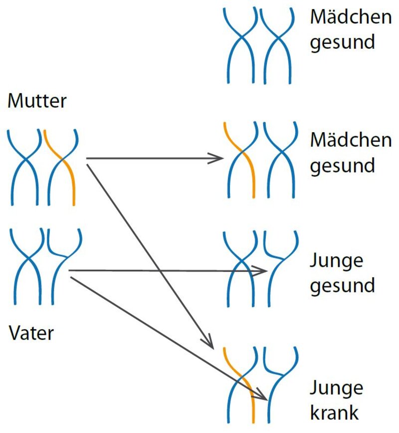 Bei der X-chromosomalen Vererbung liegt der Defekt auf dem Geschlechtschromosom X. Da Mädchen jeweils zwei X-Chromosomen besitzen erkranken sie nicht, da das gesunde Chromosom den Defekt ausgleicht. Jungen erkranken dann, wenn sie das kranke Gen von der Mutter erben.