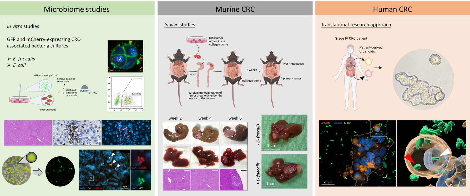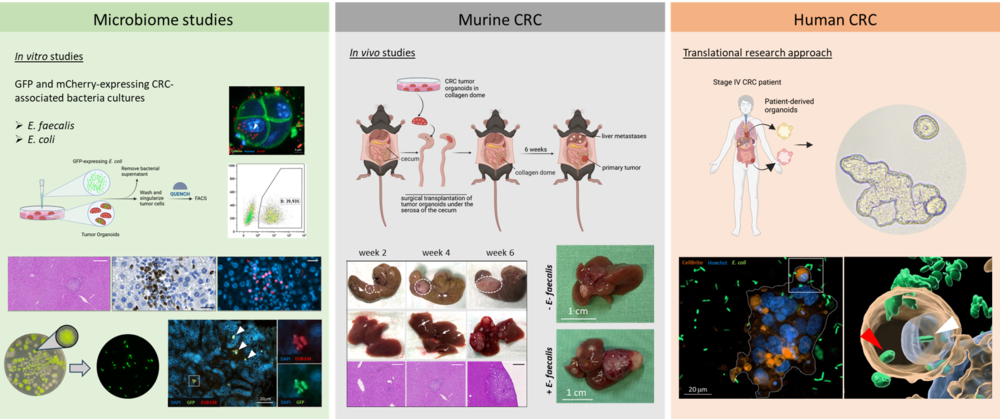 The focus of our group is the role of the metastasis-associated microbiome within the TME in murine CRC models and patient cohorts. Our objective is to uncover the intricate interactions between the cells of the TME, the microbiome and the tumor cells at the metastatic site. By gaining new insights into the establishment of a pro-tumorigenic TME and metastatic microbiome, we aim to identify potential targets for therapeutic interventions. Specifically, our focus is on disrupting detrimental interactions between bacteria and tumor cells to interfere with the development of the TME in the liver. These findings will have implications for understanding the retrospective and prospective impact of the metastasis-associated microbiome on prognosis, survival, and therapeutic response. The integration of our CRC-focused approaches with microbiome research positions our work to be highly competitive in the field.