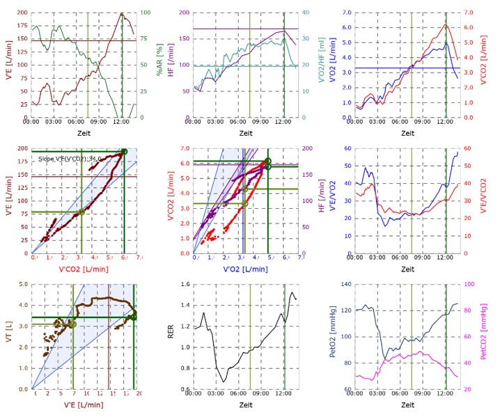 Die gemessenen Werte ermöglichen uns die Errechnung einer Reihe von weiteren Parametern, wie den respiratorischer Quotient, Atemäquivalent, Atemeffizienz, Sauerstoffpuls/ Schlafvolumen. Die Leistungsfähigkeit wird nicht durch den Atemtrakt alleine gewährleistet, sondern durch ein komplexes Zusammenspiel von Herz, Kreislauf, Muskulatur sowie Stoffwechsel, daher geben die Ergebnisse einen qualitativen und quantitativen Überblick über das optimale Zusammenspiel der verschiedenen Organsysteme und damit die gesamte Leistungsfähigkeit.