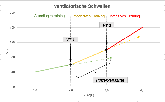 Es wird deutlich, dass zunächst ein geringer Ventilationsaufwand zur Generierung der aeroben Leistung (grün) erforderlich ist. Danach muss die Ventilation darüber hinaus gesteigert werden (orange), um das anfallende Exzess-CO2 abzuatmen (VT1), dadurch entsteht der erste Knick in der Kurve. Nach Aufbrauchen der Pufferungskapazität ist zur Kompensation der Azidose eine nochmalige Steigerung der Ventilation (2. Knick) erforderlich, dieser zweiter Knick stellt die VT2 dar.