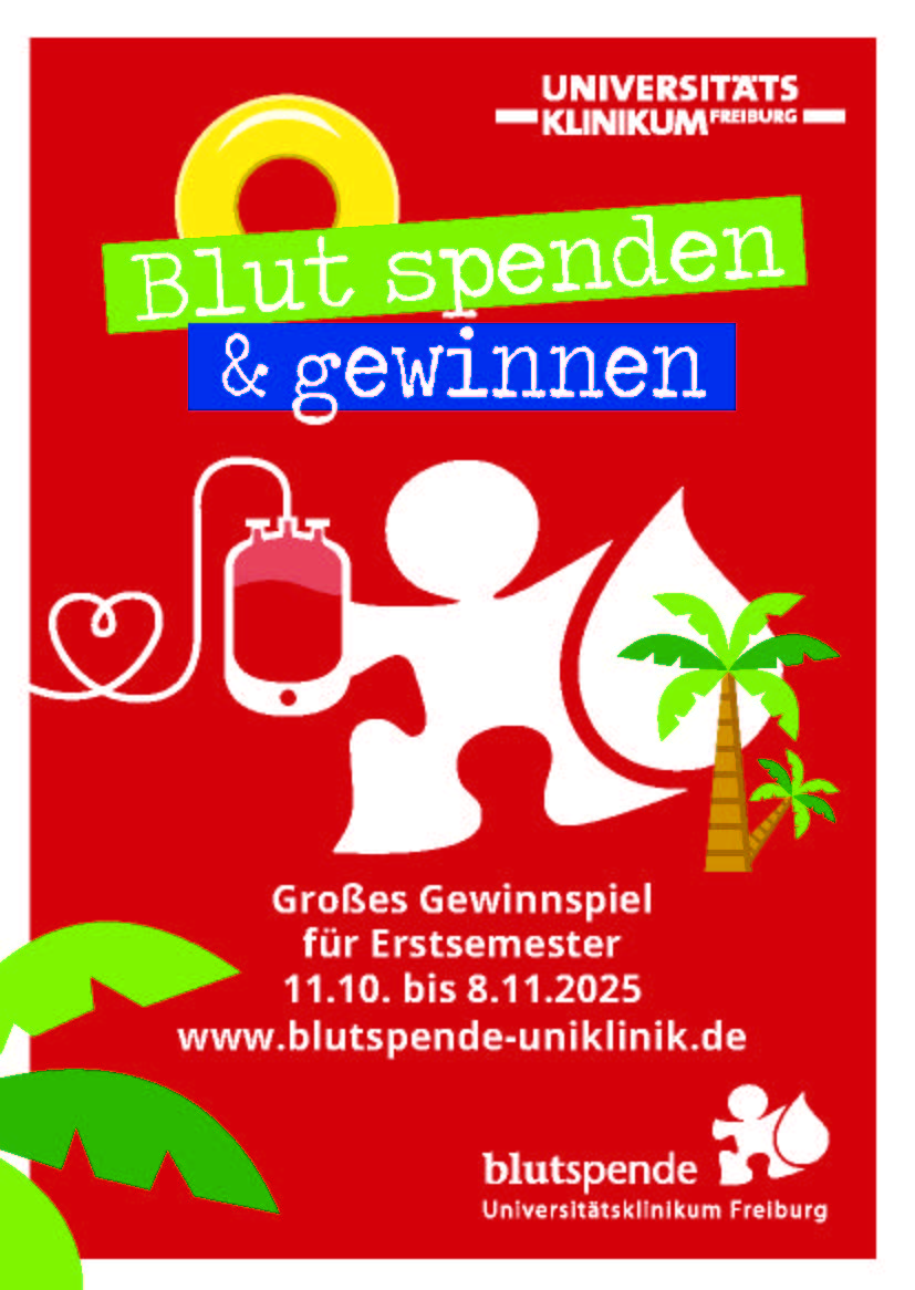 Wer mithelfen möchte, den Wanderpokal nach Freiburg zu holen, braucht dafür nur den Teilnahmeschein auszufüllen, den es an der Anmeldung der Blutspende gibt. Diesen dann bitte in die Box im Wartebereich einwerfen. Teilnehmen kann jede*r - nicht nur Studierende. Unter allen Teilnehmenden verlosen die Studierenden drei Buchgutscheine im Wert von 50 Euro und weitere tolle Preise.