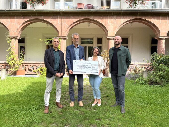 Bild: Übergabe des symbolischen Spendenschecks (v.l.n.r.): Jesús Bastante Medina, Geschäftsführung Taifun-Tofu GmbH, Prof. Dr. Christian Fleischhaker, Kommissarischer Ärztlicher Direktor der Klinik für Psychiatrie, Psychotherapie und Psychosomatik im Kindes- und Jugendalter und 1. Vorsitzender der Freiburger Vereinigung zur Hilfe für psychisch kranke Kinder und Jugendliche e.V., Dr. Madeleine Zimmermann, 2. Vorsitzende und Geschäftsführende Oberärztin der Klinik, Elias Hauguth, Pressesprecher Taifun-Tofu GmbH. Bildquelle: Universitätsklinikum Freiburg