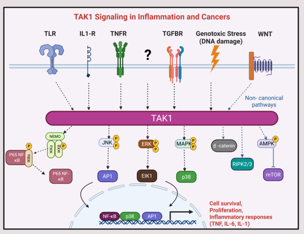 TAK1 functions as a central signaling hub linking inflammatory, stress, and developmental pathways. It activates NF-κB and MAPK pathways governing immune cell activation, proliferation, and survival, with critical roles in cancers and inflammatory diseases. Our research focuses on understanding how dysregulated TAK1 activity in immune, cancer, and tissue-resident cells drive pathological inflammation, tumor growth, and immune-related toxicities. We are particularly interested in exploring whether TAK1 inhibition can reverse these effects, offering new therapeutic avenues in cancer and inflammation.