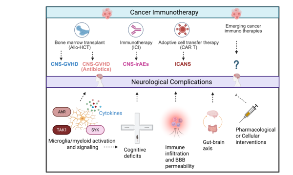 We have developed novel preclinical models that recapitulate Immune-cell-associated neurotoxicity-syndrome (ICANS), Immune-related-adverse-events (CNS-irAEs), Graft-verus-host diseases (CNS-GVHD) and demonstrated that the kinases TAK1 and Spleen tyrosine kinase (SYK) are key drivers of neuroinflammation. Targeting these kinases effectively alleviated neuroinflammatory responses and improved cognitive function in mice (Nature Cancer 2024, Science Translational Medicine 2024, JCI 2020). Building on these findings, we now apply and expand these models to emerging cancer immunotherapies, with the goal of identifying predictive biomarkers, validating therapeutic targets, advancing cellular therapy approaches to develop neuroprotective strategies. Alongside leverage kinase inhibition (TAK1, SYK, ROCK1) as a therapeutic strategy to mitigate these toxicities. Ultimately, our aim is to mitigate CNS complications while preserving or even enhancing the potent antitumor efficacy of these transformative treatments.