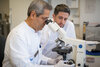 Bild1: Prof. Dr. Ali Al-Ahmad (li.) und Prof. Dr. Fabian Cieplik betrachten unter dem Mikroskop die Probe eines oralen Bakteriums.
