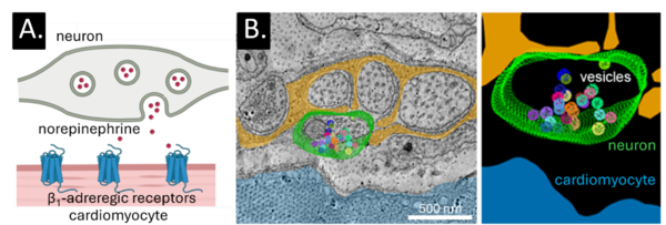 Das intrakardiale Nervensystem spielt eine zentrale Rolle bei der fein abgestimmten Regulation der Herzfunktion. Die Effizienz und Präzision der neuro-kardialen Kommunikation werden maßgeblich durch die ultrastrukturelle Geometrie der Schnittstelle zwischen Nervenzellen (Neuronen) und Herzmuskelzellen (Kardiomyozyten) bestimmt. Trotz ihrer funktionellen Bedeutung ist die nanoskalige Architektur und dynamische Organisation der neuro-kardialen Synapse bislang nur unzureichend verstanden.