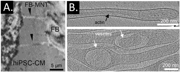 A: Kokultur aus primären humanen kardialen Fibroblasten (FB, rechts) und hiPSC-Kardiomyozyten (links); fibroblastäre Membran-Nanotubuli (FB-MNT) interagieren direkt mit den Membranen der hiPSC-Kardiomyozyten.