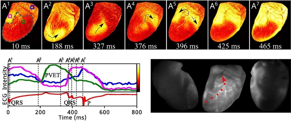 Abb. 1: Arrhythmie nach Reperfusion. A1–A7: Bildsequenzen, die die kardiale Erregungsausbreitung durch die zuvor ischämische Zone (graue gestrichelte Linien) zeigen, was zur Wiedererregung des gesamten Herzens führt. Unten links: Intensitäten aus den in A1 dargestellten Regionen von Interesse sowie das entsprechende Elektrokardiogramm, das die invertierte Erregungsabfolge demonstriert (QRS-Komplex gefolgt von P-Welle). Unten rechts: Aufnahme nach Perfusion mit fluoreszierenden Mikrosphären, die den Hauptast der perfundierten Koronararterie zeigt.