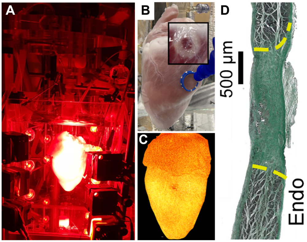 Fig. 2: Ablationen ex vivo und in vivo. A) Ablationen werden an einem Langendorff-perfundierten Herzen durchgeführt, wobei ihre Auswirkungen auf die elektrische Erregungsleitung mittels optischem Mapping überwacht werden.