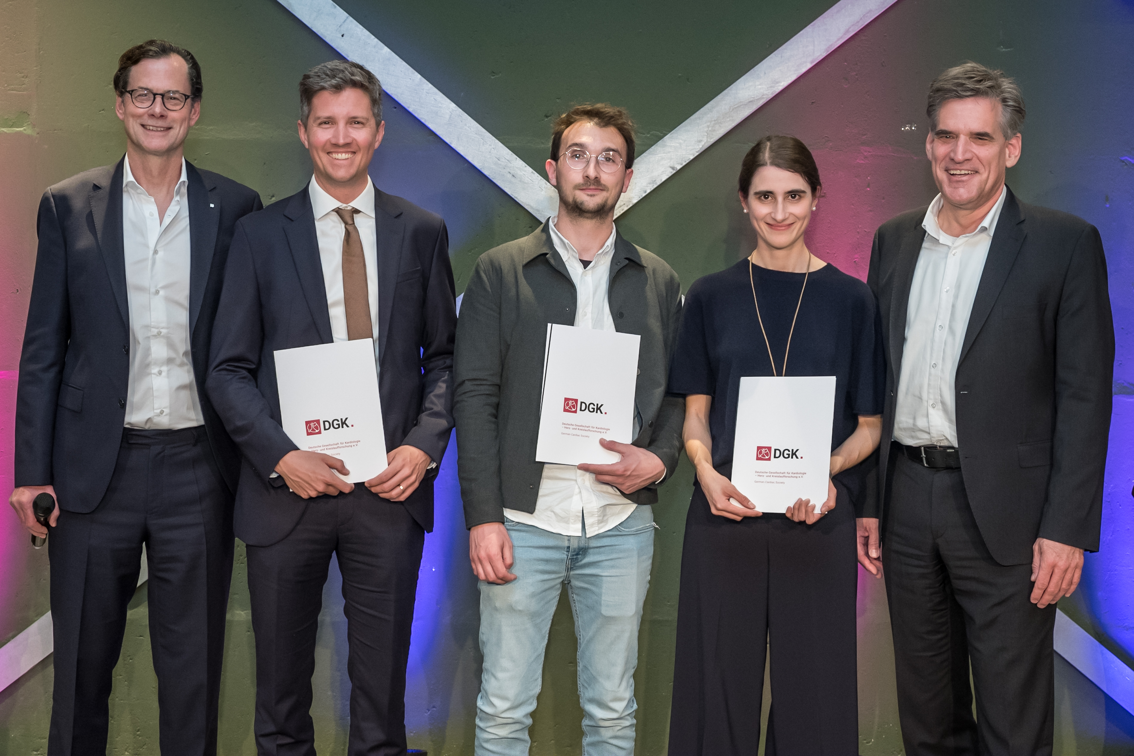 Auf dem Foto v.l.n.r.: Prof. Dr. Stephan Willems, 2. Preisträger PD Dr. Felix Wegner, 1. Preisträger Dr. Arthur Boileve, 2. Preisträgerin Dr. Juliana Senftinger, Prof. Dr. Stefan Blankenberg (©DGK/Thomas Hauss)