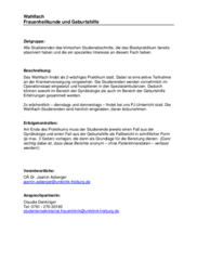 Das Wahlfach findet als 2-wöchiges Praktikum statt. Dabei ist eine aktive Teilnahme an der Krankenversorgung vorgesehen. Die Studierenden werden vornehmlich im Operationssaal eingesetzt und hospitieren in den Spezialambulanzen. Dadurch können sowohl im Bereich der Gynäkologie als auch im Bereich der Geburtshilfe Erfahrungen gesammelt werden.