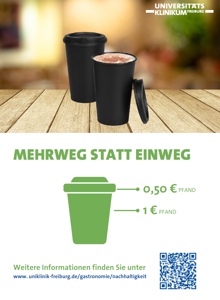 Ab Januar 2025 werden an der Uniklinik Freiburg neue Mehrweg-Kaffeebecher für den Genuss „to go“ eingeführt, die den bisherigen Recup-Becher ersetzen. Der neue Mehrweg-Kaffeebecher besteht aus langlebigen und BPA-freien Materialien, entspricht den EU-Lebensmittelverordnungen und trägt zur Reduzierung von Einwegmüll bei.