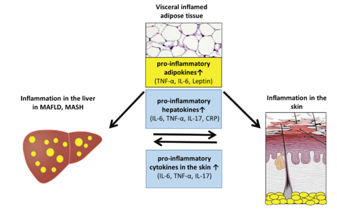Network between adipose tissue, liver and skin (modified from Mantovani et al. IJMS 2016; Heitmann et al. JDDG, 2021)
