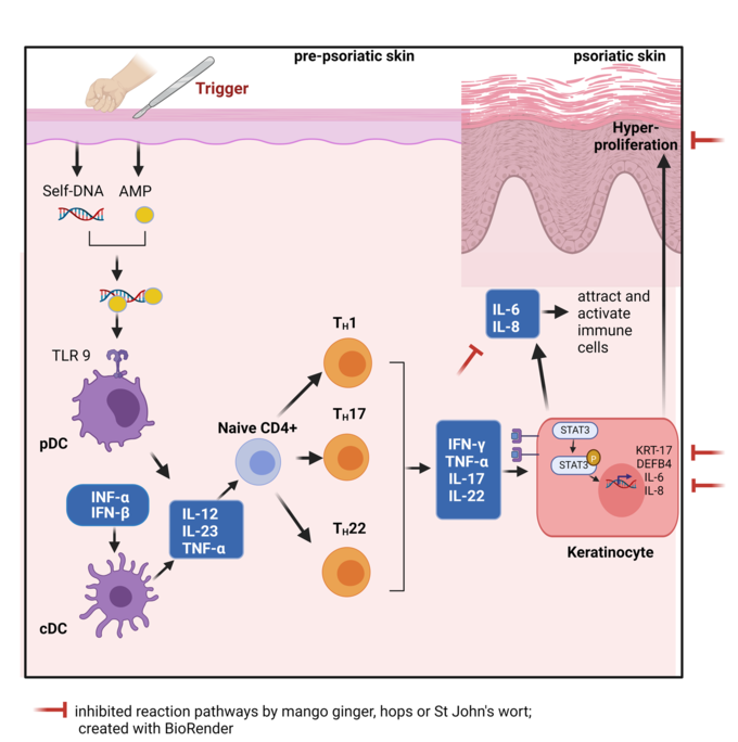 In this project, the anti-psoriatic effect of traditionally used and novel botanical compounds was investigated. Of particular interest are active plant compounds from Centella asiatica (asiatic pennywort with madecassoids and asiaticosides), Mahonia aquifolium (mahonia with berberine), Curcuma amada (mango ginger with the diterpenoid LDD) and Whrightia tinctoria (sweet indraja with triterpenes and sterols), as they have been used in Ayurvedic and traditional Chinese medicine for thousands of years to treat skin diseases. In addition, the traditional medicinal plants from occidental monastic medicine Hypericum perforatum (St. John's wort with hyperforin) and Humulus lupulus (hops with humulone and lupulone) could be effective. After screening the botanical compounds for anti-inflammatory and anti-proliferative effects, hops and St. John's wort were found to be particularly promising botanical compounds in psoriasis models in vitro and ex vivo.
