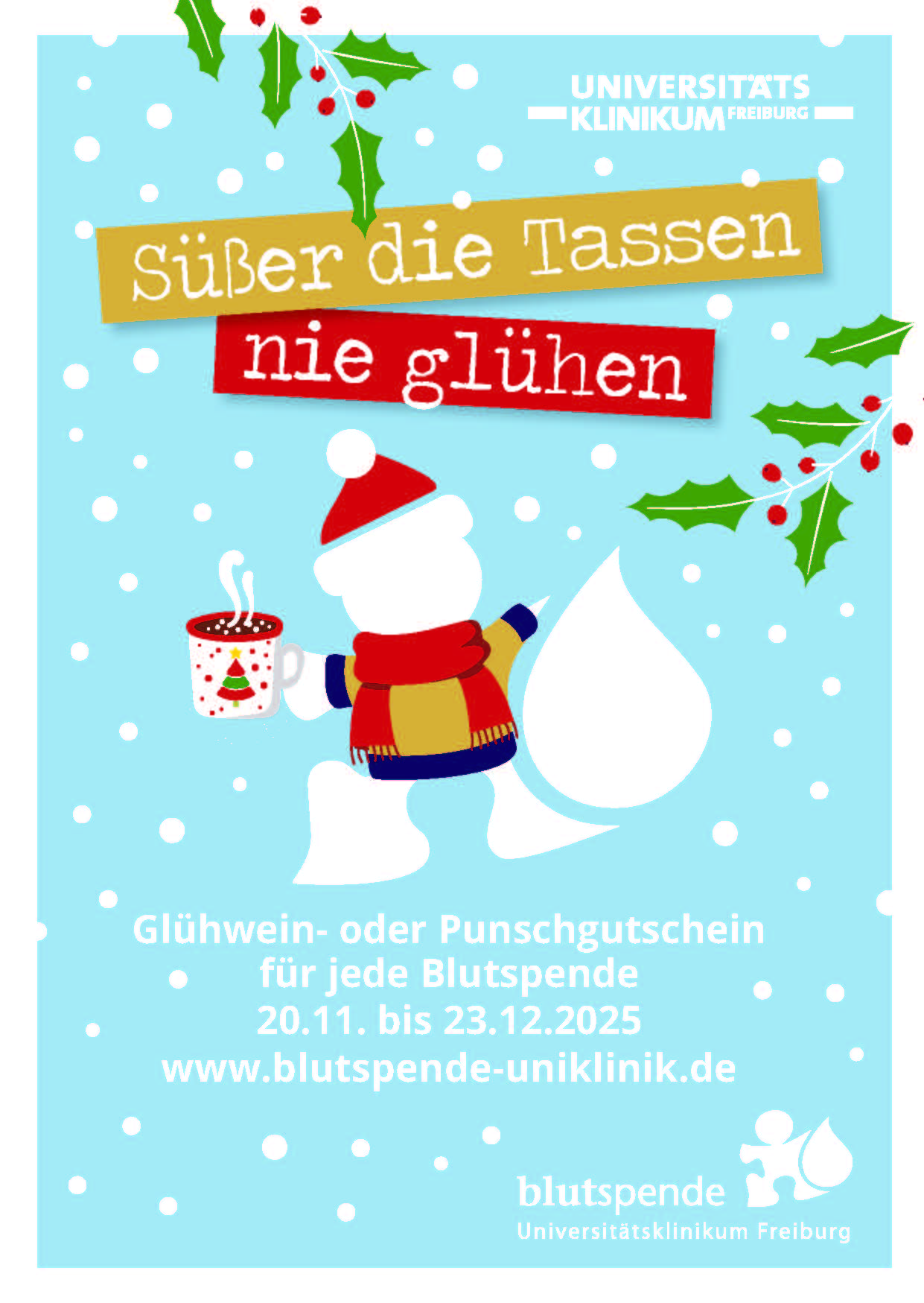 Nach der Spende ist vor dem Glühwein! Deswegen gibt's bei uns auch dieses Jahr vom 20.11. bis 23.12. einen Glühwein- oder Punschgutschein zu jeder Blutspende. Einzulösen am Stand des Badischen Winzerkellers auf dem Freiburger Weihnachtsmarkt.