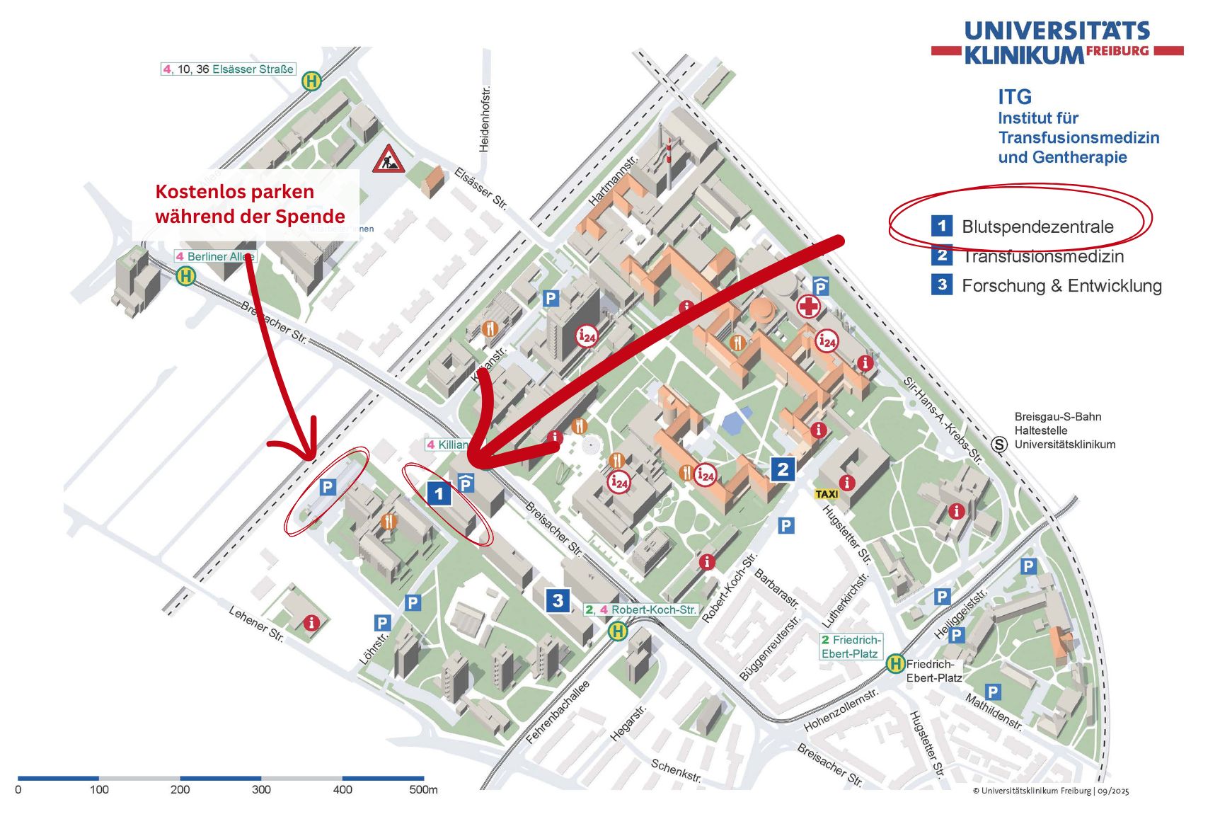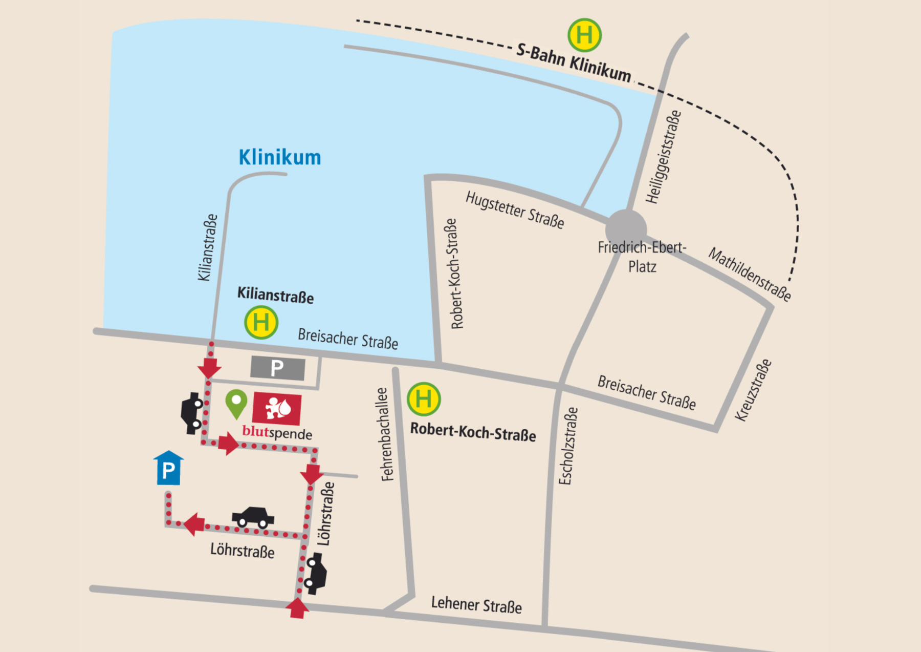 Kostenlose Parkmöglichkeiten gibt es auf dem Parkdeck der Klinik für Tumorbiologie (Löhrstraße). Sie erreichen das Parkdeck entweder über die Breisacher Straße (Einfahrt rechts vom Parkhaus an der Haltestelle "Killianstraße" und dann den blauen Parkschildern folgen) oder über die Lehener Straße (Einfahrt gegenüber der Agentur für Arbeit). Ihr Ticket können Sie an der Anmeldung der Blutspende entwerten lassen.