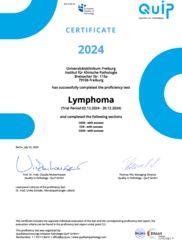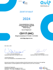 Die einzelnen Fachbereiche des Instituts für Klinische Pathologie am Universitätsklinikum Freiburg erfüllt für alle Untersuchungsmethoden (Makroskopie, Histologie, Zytologie, Immunhistochemie und Immunzytologie sowie der Molekularpathologie) die Anforderungen anhand der gültigen Akkreditierung nach DIN EN ISO / IEC 17020:2012 und der DIN EN ISO 15189:2024.