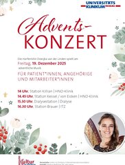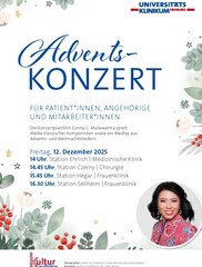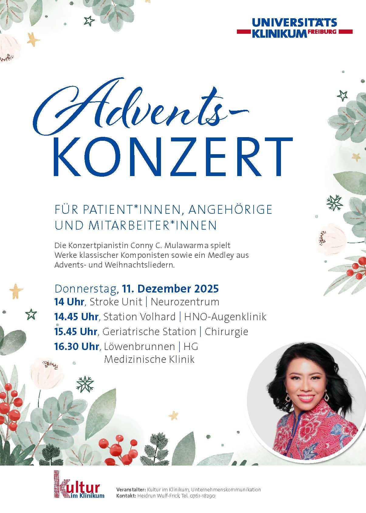 Am Freitag, 12. Dezember 2025 spielt die Konzertpianistin Conny C. Mulawarma jeweils ein Programm mit Werken klassischer Komponisten sowie einem Medley aus Advents- und Weihnachtsliedern. Start ist um 14 Uhr auf Station Ehrlich (Medizinische Klinik), um 14.45 Uhr auf Station Czerny (Chirurgie), um 15.45 Uhr auf Station Hegar (Frauenklinik) und um 16.30 Uhr auf Station Sellheim (Frauenklinik).