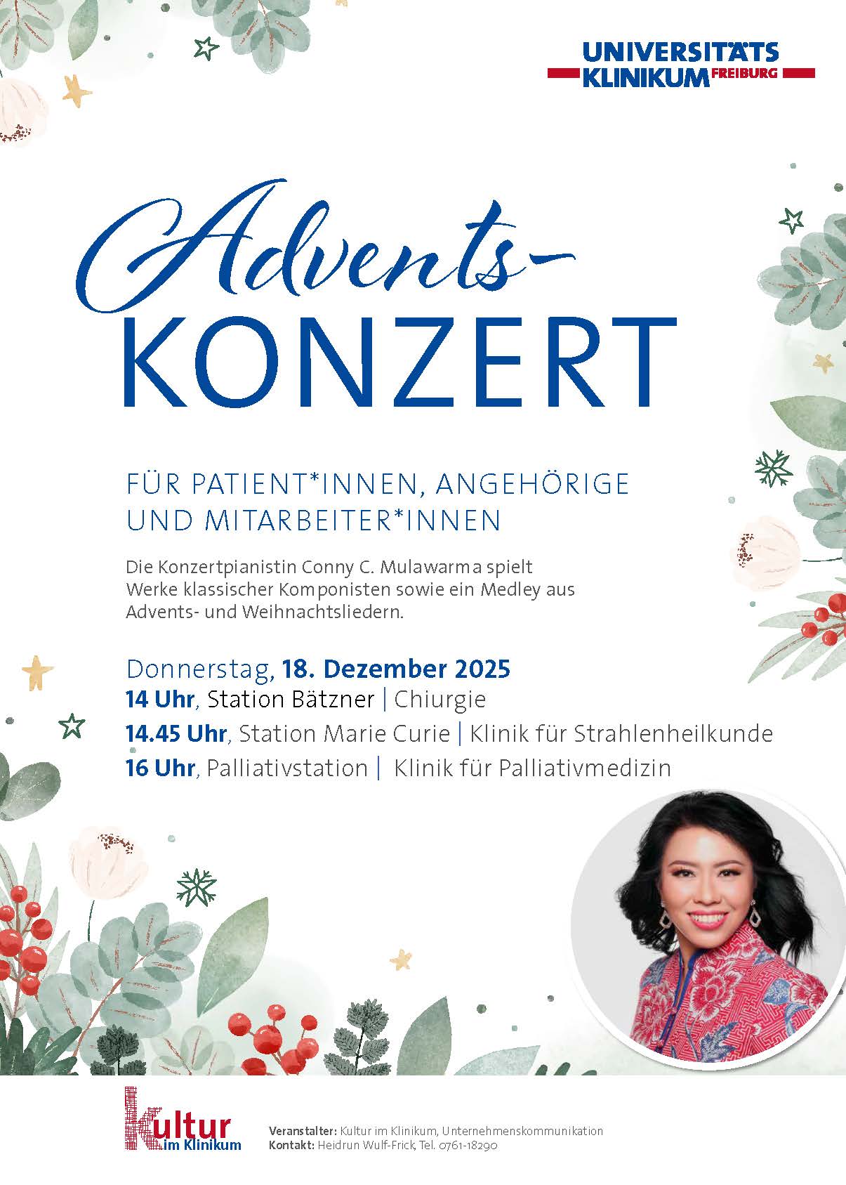 Am Donnerstag, 18. Dezember 2025 spielt die Konzertpianistin Conny C. Mulawarma jeweils ein Programm mit Werken klassischer Komponisten sowie einem Medley aus Advents- und Weihnachtsliedern. Start ist um 14 Uhr auf Station Bätzner (Chirurgie), um 14.45 Uhr auf Station Marie Curie (Strahlenheilkunde) sowie um 16 Uhr auf der Palliativstation (Klinik für Palliativmedizin).