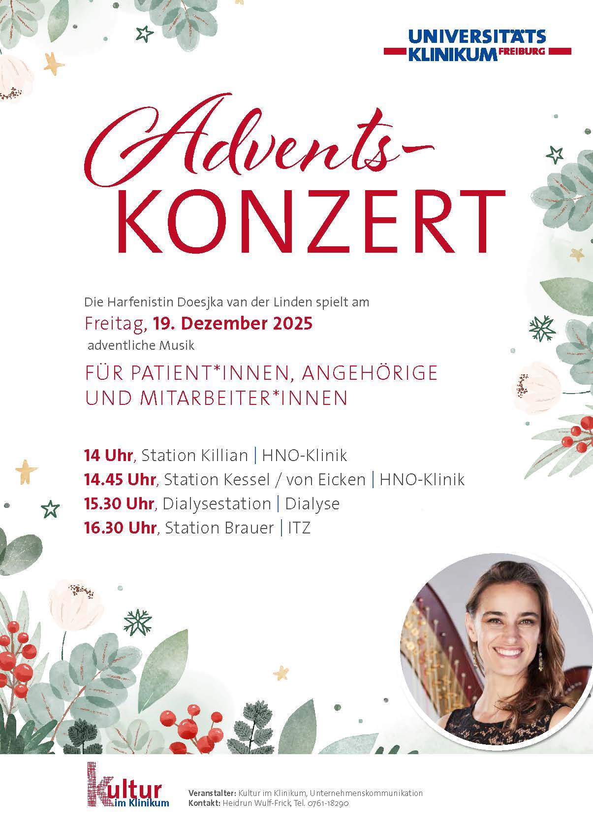 Seit 2013 bringt das Angebot „Kultur im Klinikum“ des Universitätsklinikums Freiburg Musik auf ausgewählte Stationen in verschiedenen Kliniken. In der Adventszeit spielen regelmäßig Musiker*innen weihnachtliche Stücke zum Hören und Mitsingen. Im Jahreslauf bieten musikalische Grüße unterschiedlicher Ensembles willkommene Abwechslung für die Patient*innen.