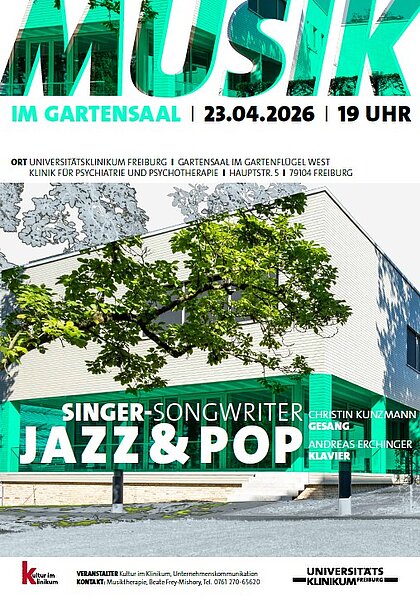 Zum zweiten Konzert des Jahres in der Reihe „Musik im Gartensaal“ lädt die Klinik für Psychiatrie und Psychotherapie der Uniklinik Freiburg alle Interessierten am Donnerstag, 23. April um 19 Uhr ein. Christin Kunzmann und Andreas Erchinger präsentieren ein Duo-Programm mit eigenen Liedern zwischen Singer-Songwriter, Pop und Jazz. Das Konzert findet im Gartensaal der Klinik für Psychiatrie und Psychotherapie, Gartenflügel West, Hauptstraße 5 in Freiburg statt. Der Eintritt ist frei, eine Anmeldung ist nicht erforderlich.