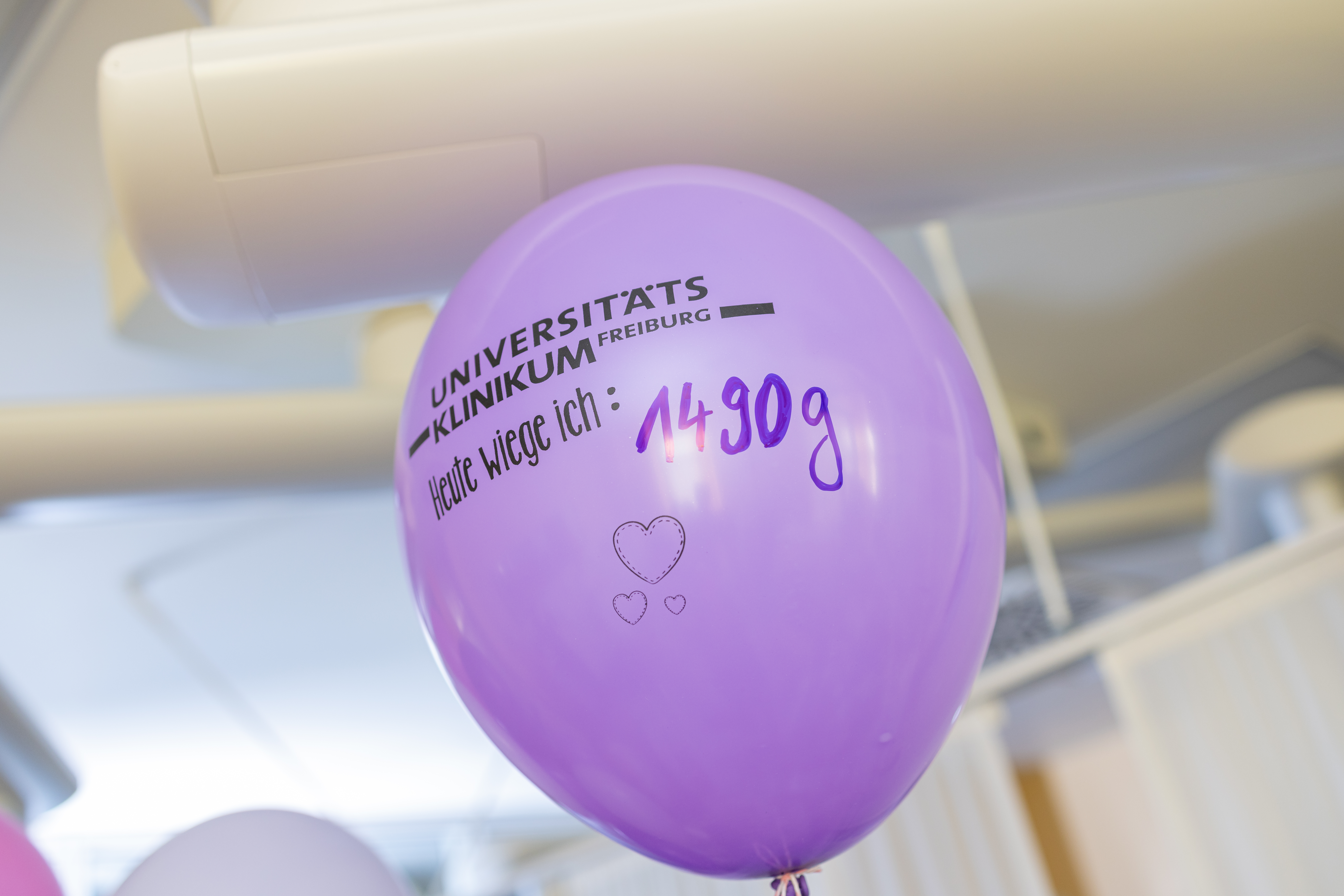 Bildunterschrift Bild 1: Auch auf der Frühgeborenenintensivstation des Universitätsklinikums Freiburg werden Zeichen gesetzt: Mit bunten Ballons an den Inkubatoren werden Gewichtsmeilensteine der Frühgeborenen gefeiert.