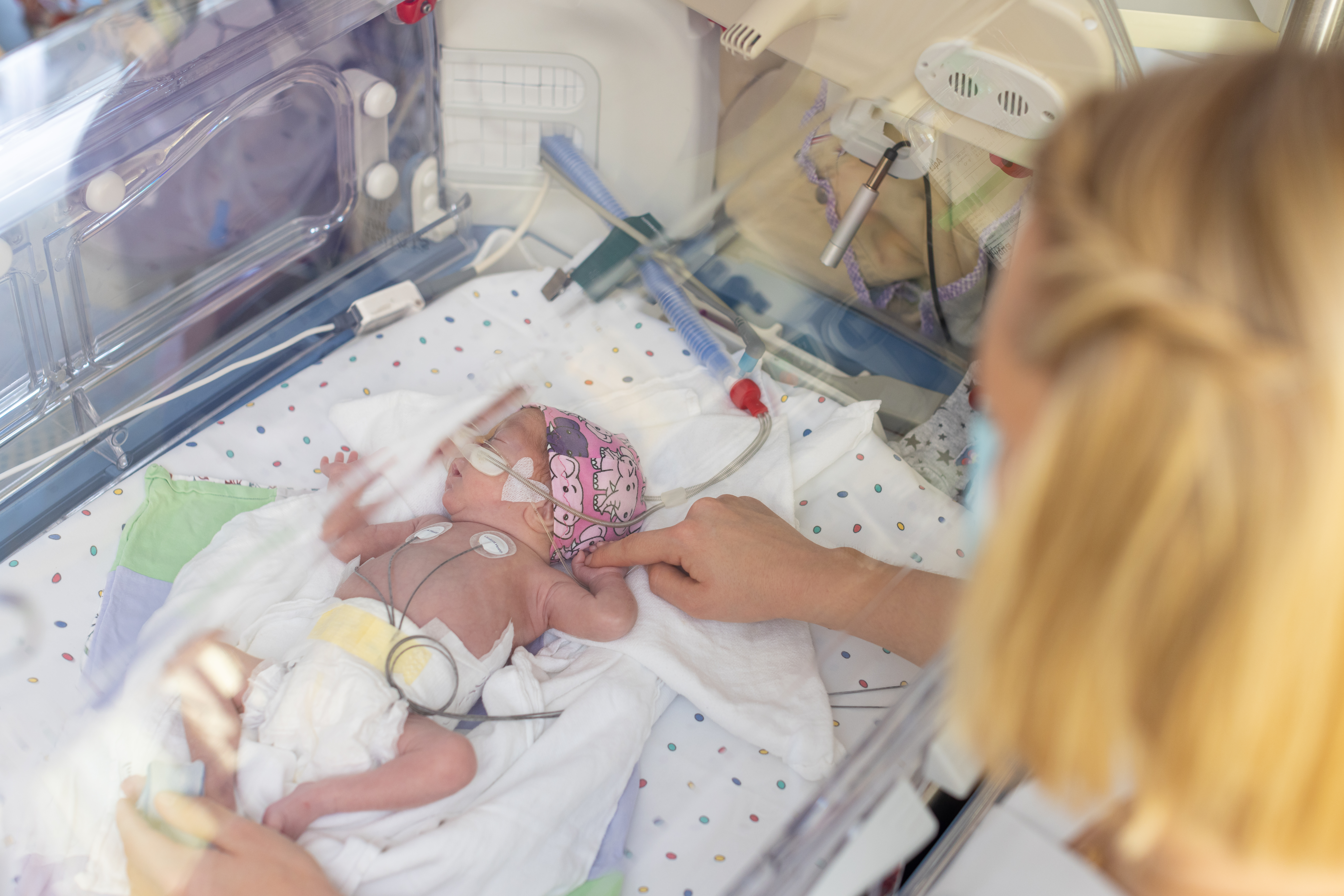 Bildunterschrift Bild 2: Wohlig warm im Inkubator und mit lila Mützchen gekleidet greift die kleine Pia nach der Hand ihrer Pflegerin.