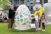 Bild 1: Neben dem großen Osterei an der Kinder- und Jugendklinik des Universitätsklinikums Freiburg ging es vergangenen Samstag bunt zu: Gemeinsam mit dem Cartoonist Peter Gaymann und Europa-Park-Maskottchen Ed Euromaus gestalteten die Teilnehmer*innen Zeichnungen des Künstlers mit Buntstiften aus.
