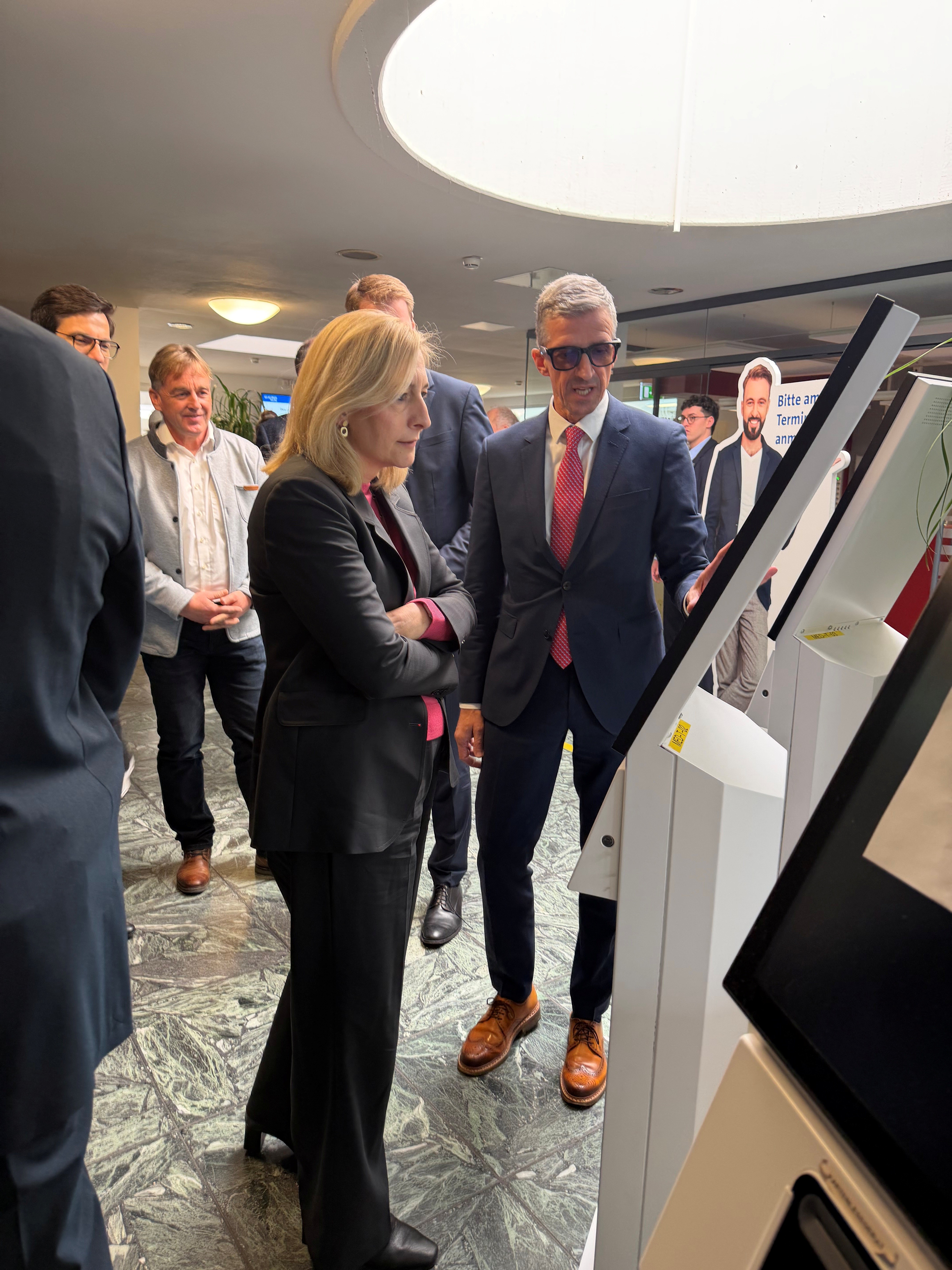 Bild 2: Wie einfach der Check-in an der digitalen Anmeldestation ist, erläutert Prof. Dr. Frederik Wenz Gesundheitsministerin Nina Warken.