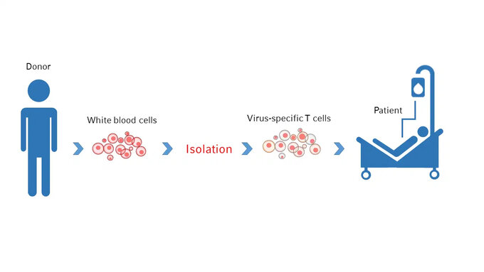 Therefore functional virus-specific T cells are directly isolated from a seropositive donor: The donor’s white blood cells are isolated from peripheral blood using a procedure called leukapheresis. From these cells, virus-specific T-cells are selected via the Cytokine Capture Approach (see T-cell Product). Virus-specific T-cells are then directly infused into the patient where they are re-stimulated by the viral infection leading to expansion and induction of viral clearance as well as sustained protection.