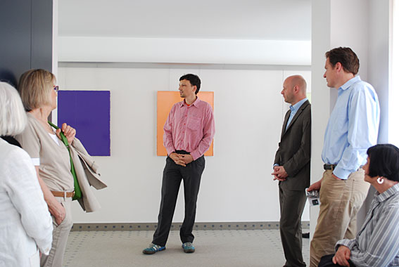 Er nahm die Besucher an die Hand und führte ihnen die einzelnen Phasen der Bildentstehung vor Augen. Handelt es sich hier um Bilder, oder nicht vielmehr um Frabphänomene, die den Bildträger als Bühne benutzen, um ihre Wirkung entfalten zu können? An den Bildrändern, so Bischoff, kann man die Farbschichtungen erkennen und damit auch die Wirkungsweise des Bildes ermessen.