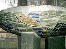 | Taufbecken | Am Taufbecken: Mosaikverzierungen, Taube Taufbecken; Bronze, Kupfer, Kleinmosaik, Granit |