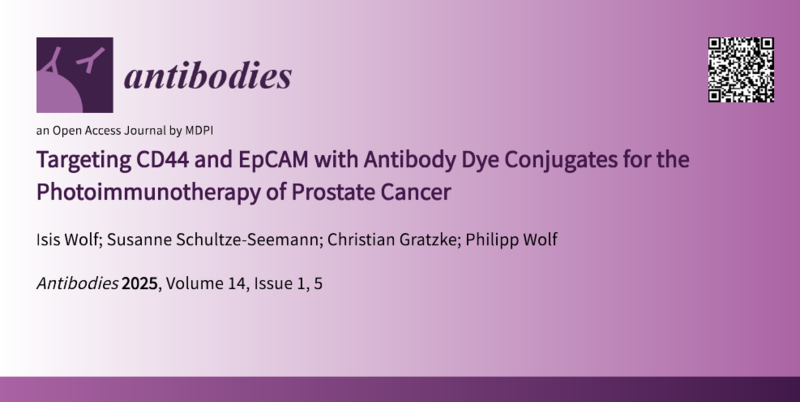 Unsere Studie “Targeting CD44 and EpCAM with antibody dye conjugates for the photoimmunotherapy of prostate cancer” ist in der Fachzeitschrift Antibodies erschienen. Darin konnten wir zeigen, dass die Zelloberflächenmarker CD44 und EpCAM vielversprechende Zielantigene für die Photoimmuntherapie des Prostatakarzinoms darstellen.